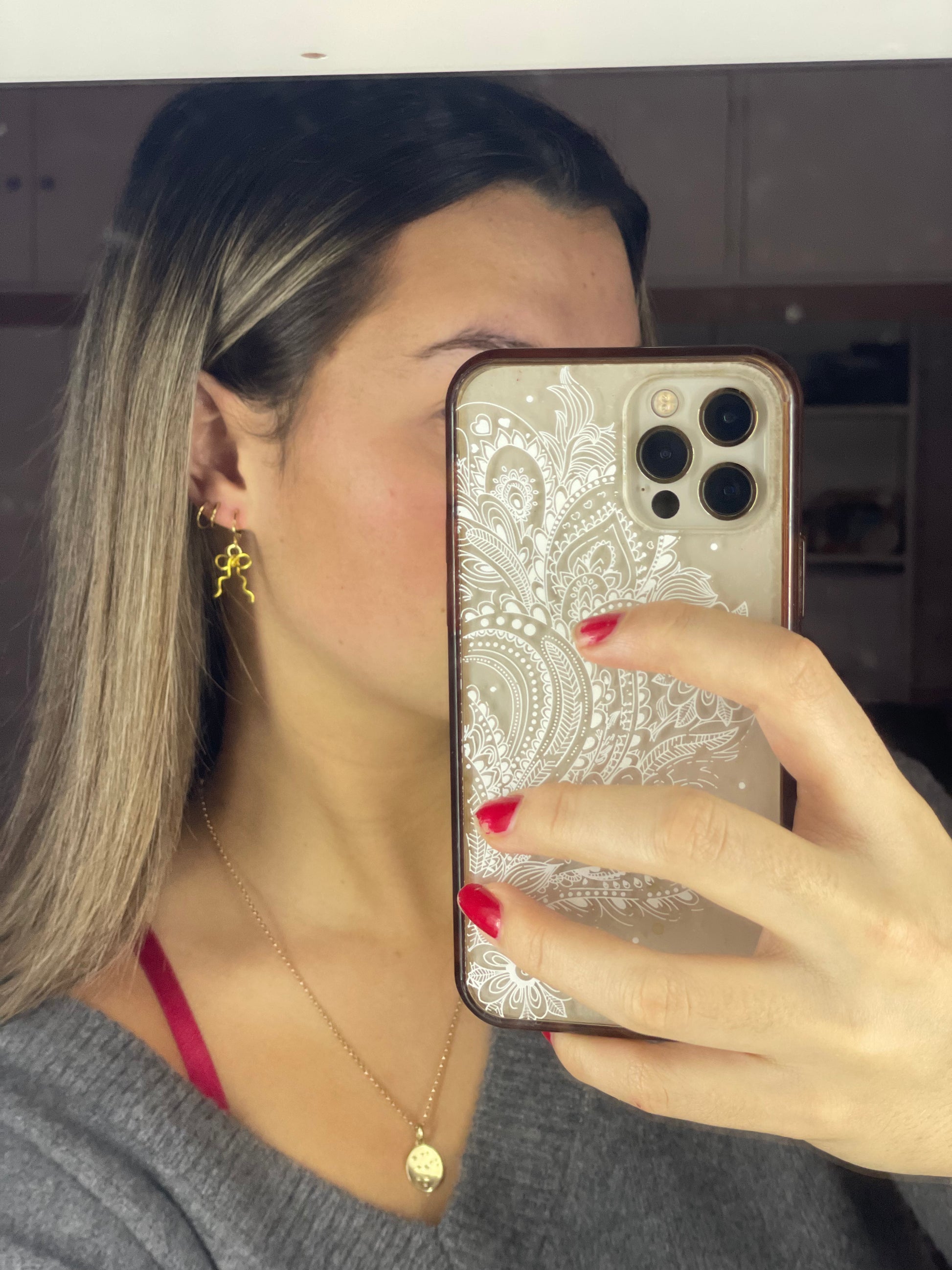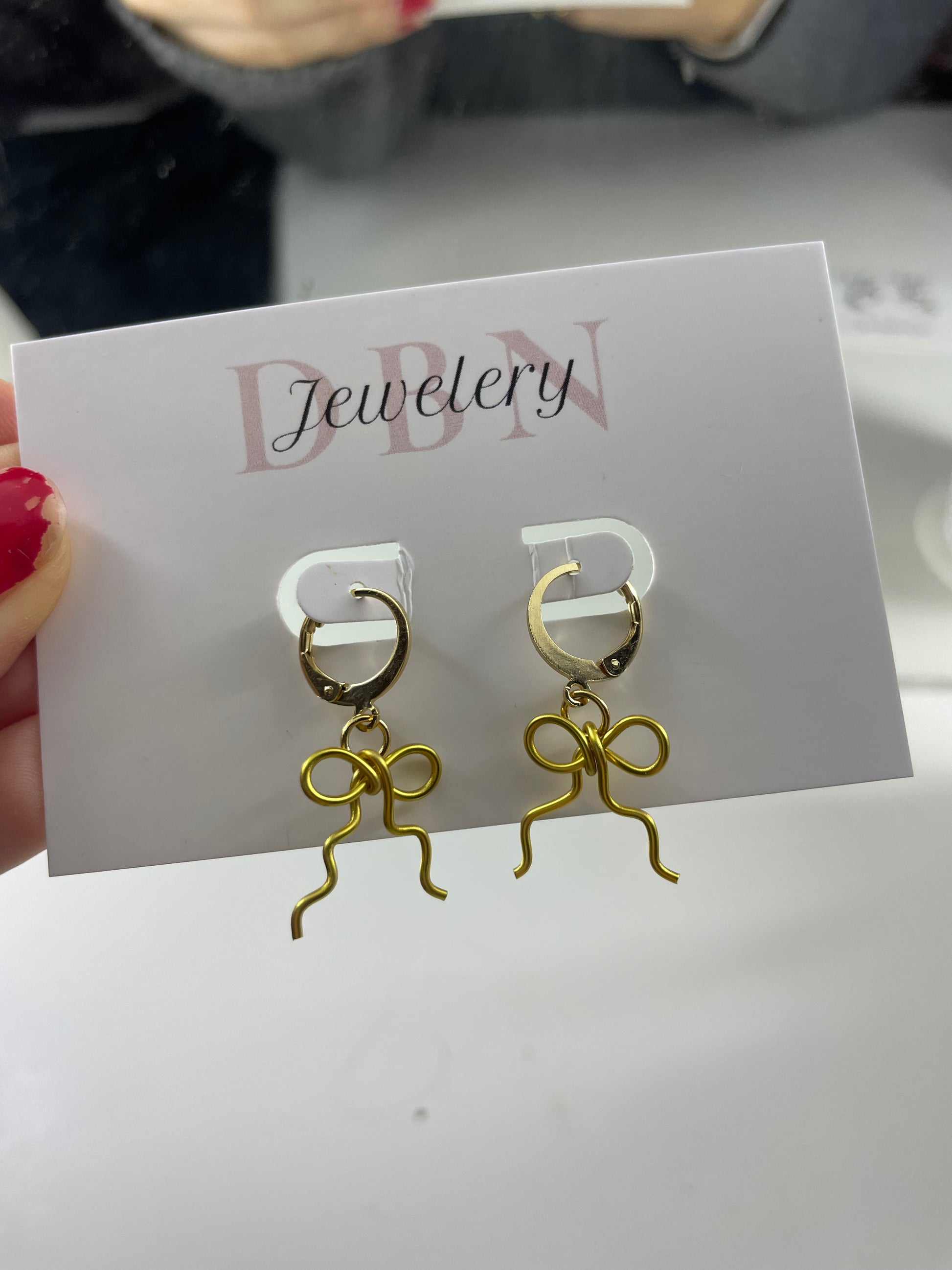 Handmade gold coloured wire charm on a gold-coloured huggie hoop.