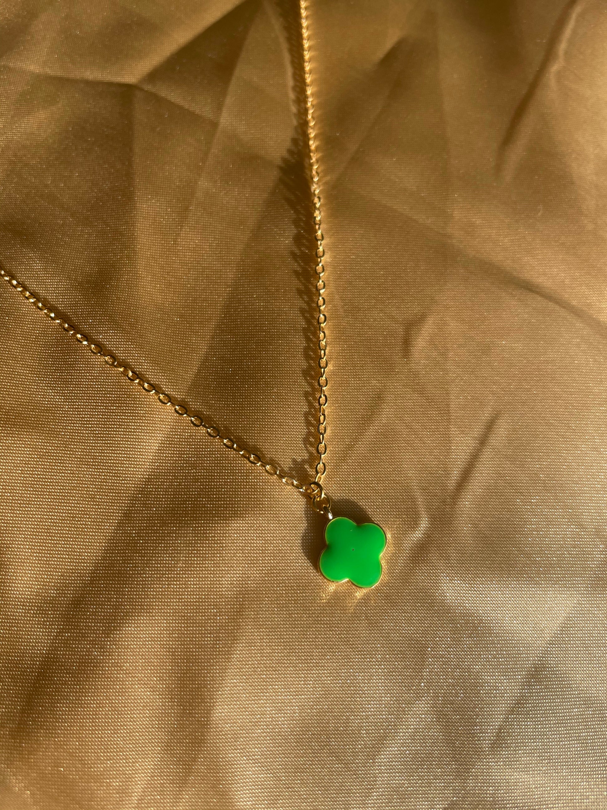 A beautiful 24kt gold plated green clover charm on a gold plated chain.