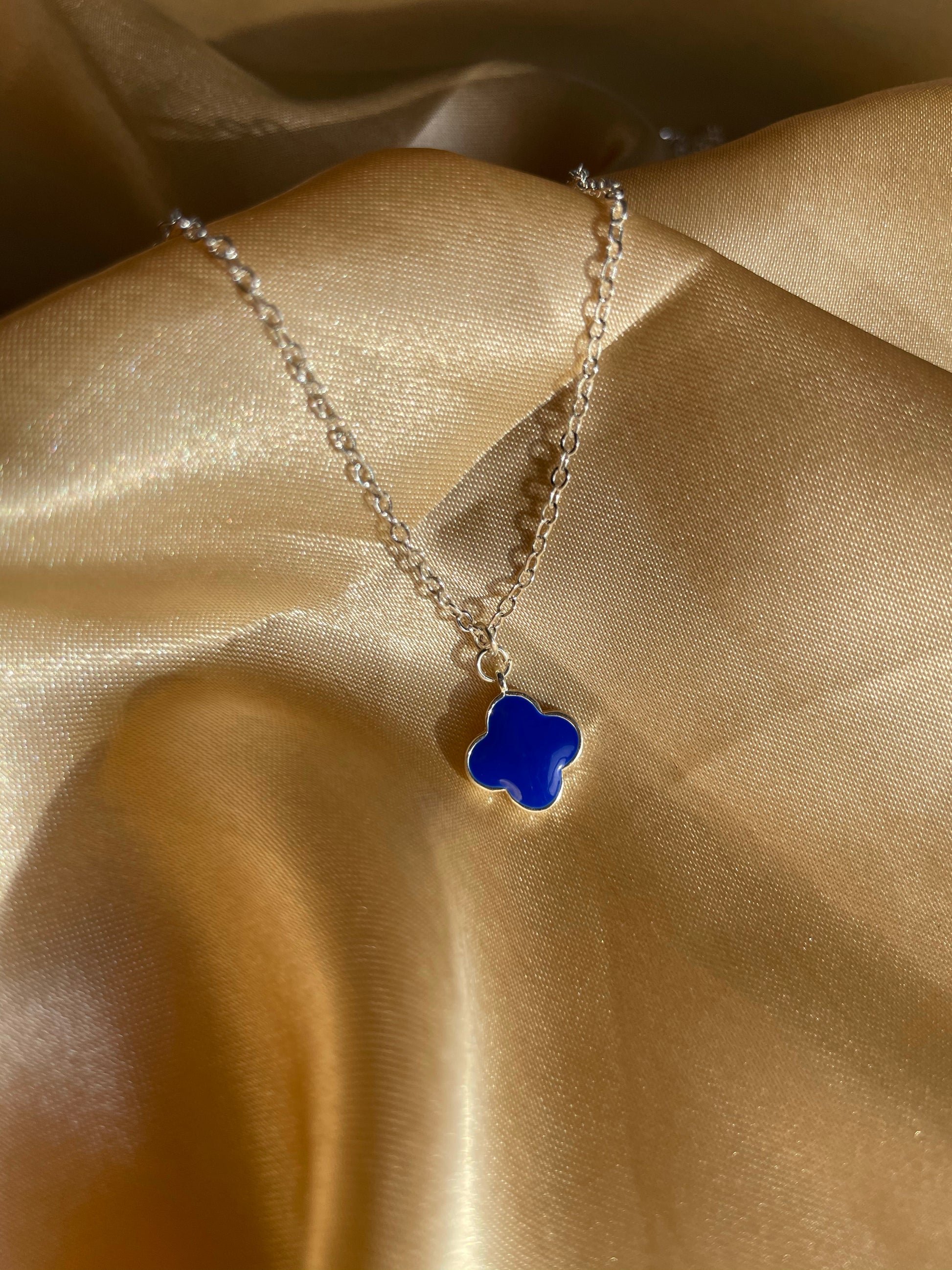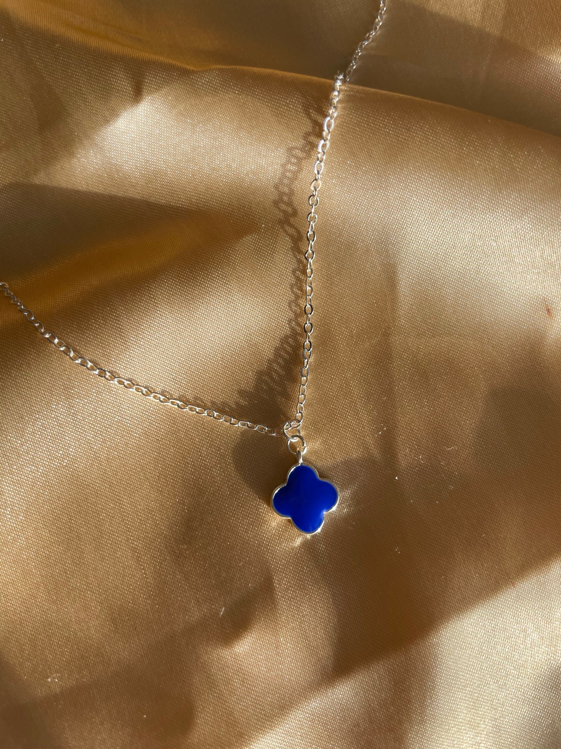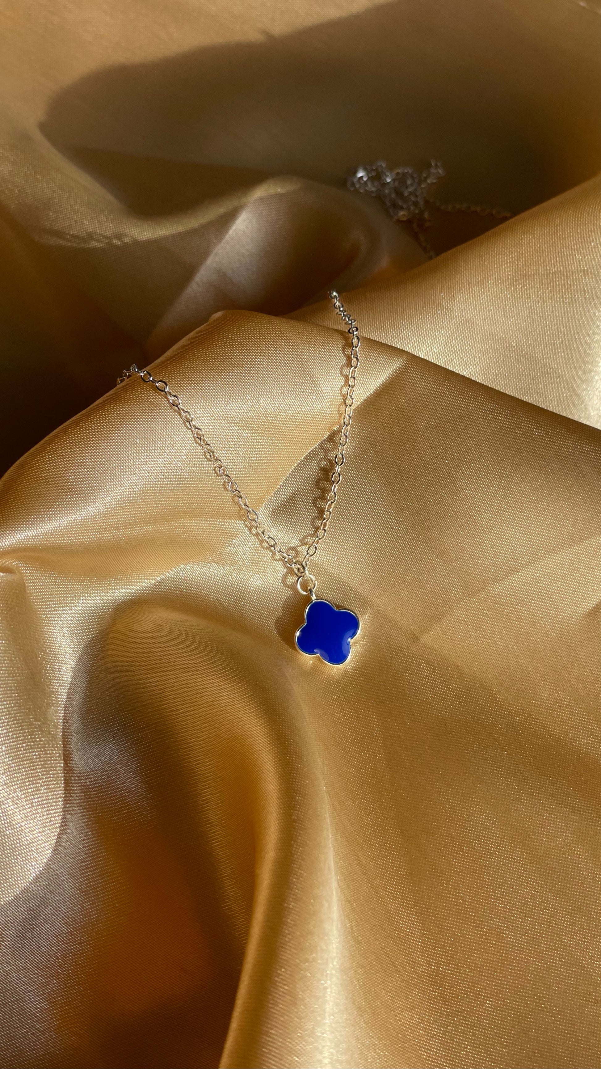 A beautiful silver plated cobalt clover charm on a silver plated chain.