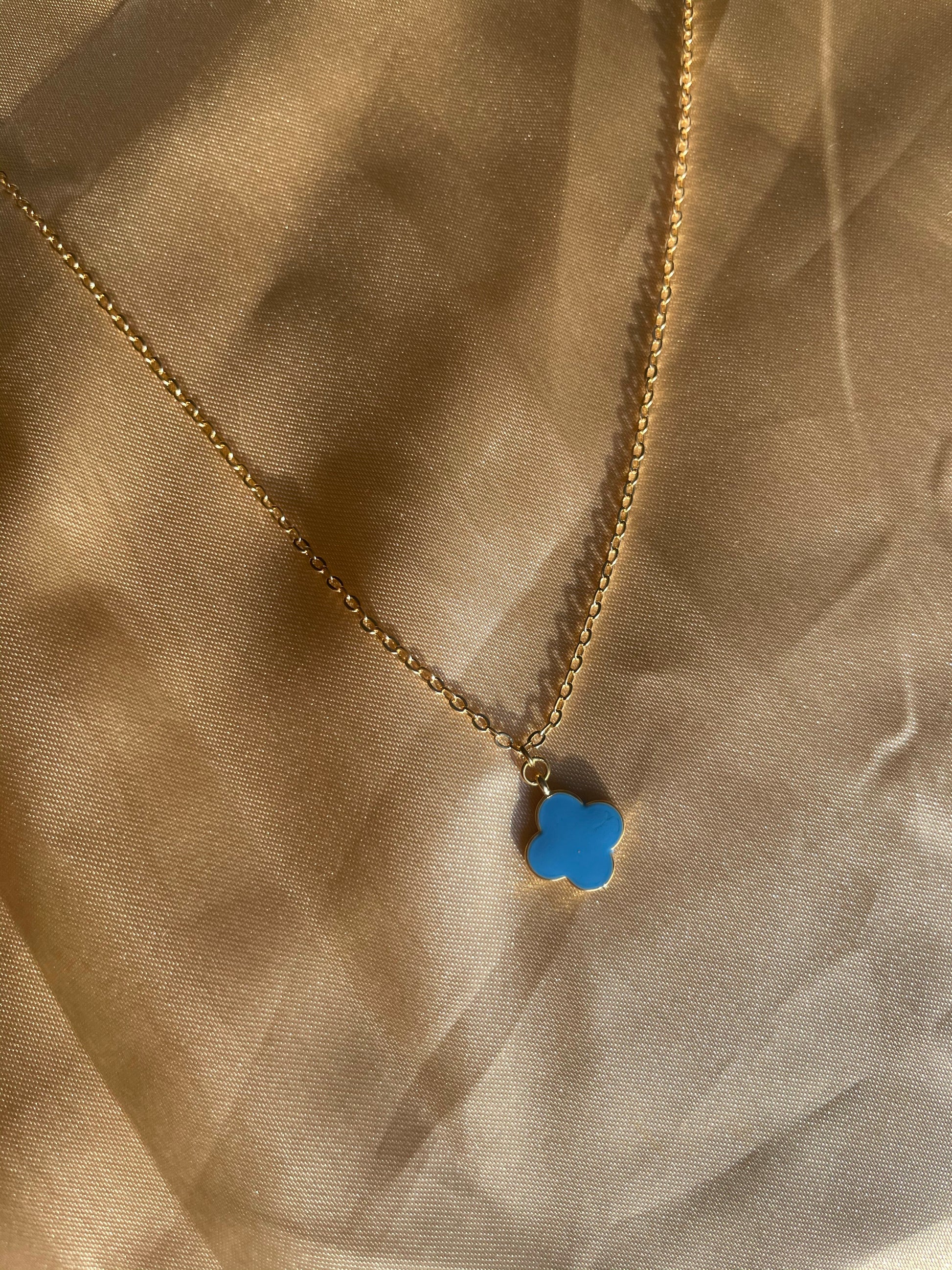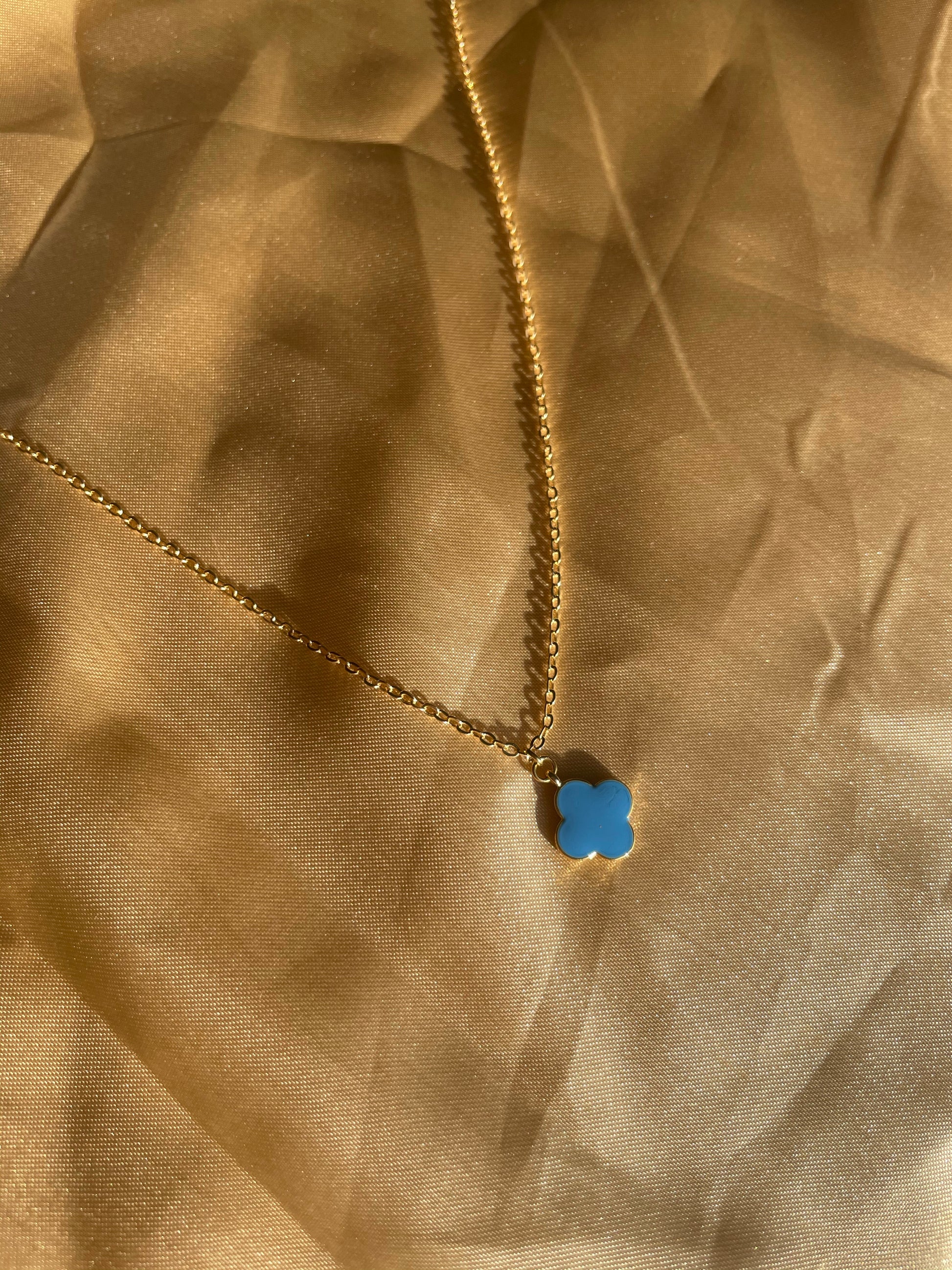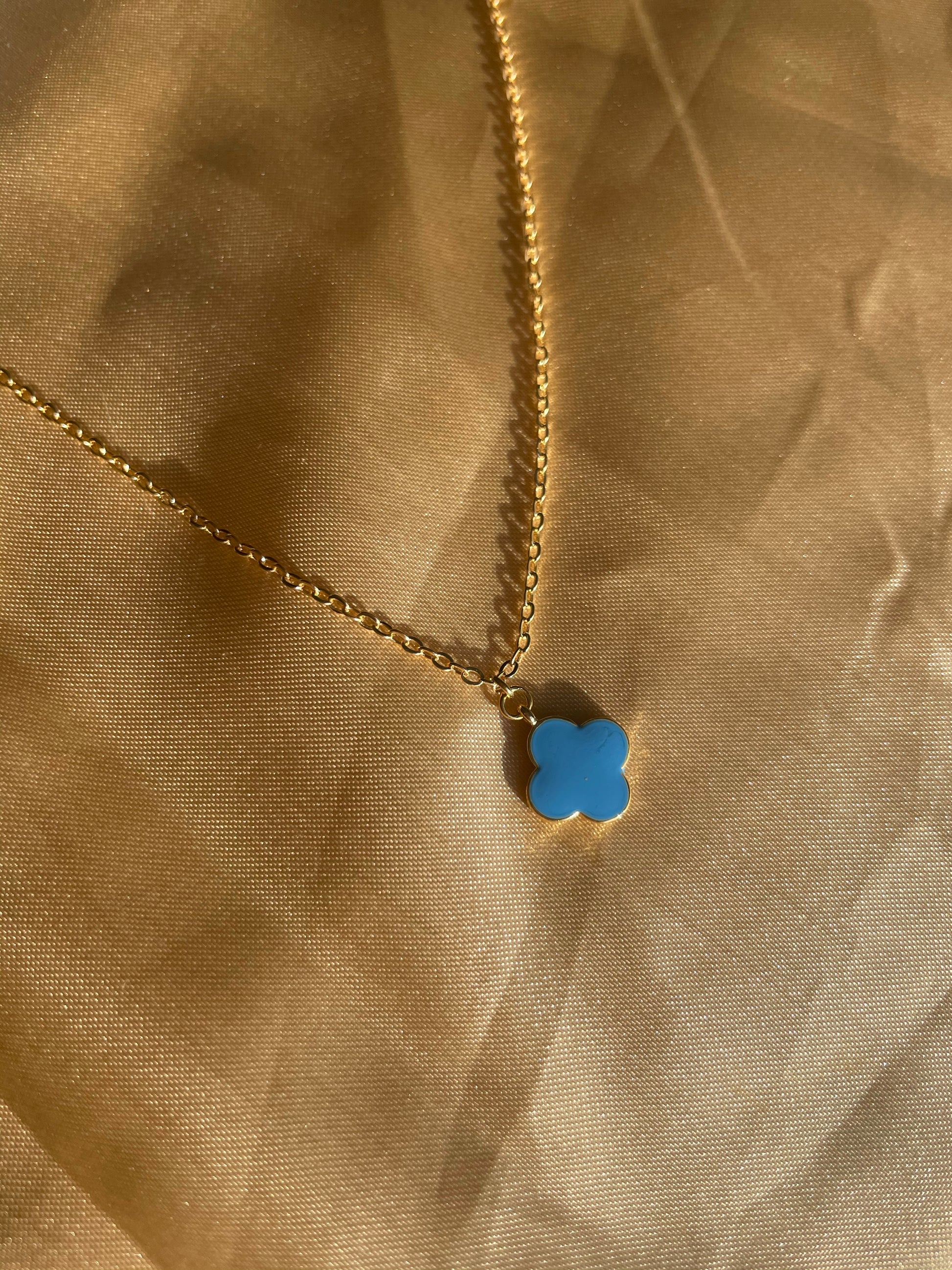 A beautiful 24kt gold plated blue clover charm on a gold plated chain.
