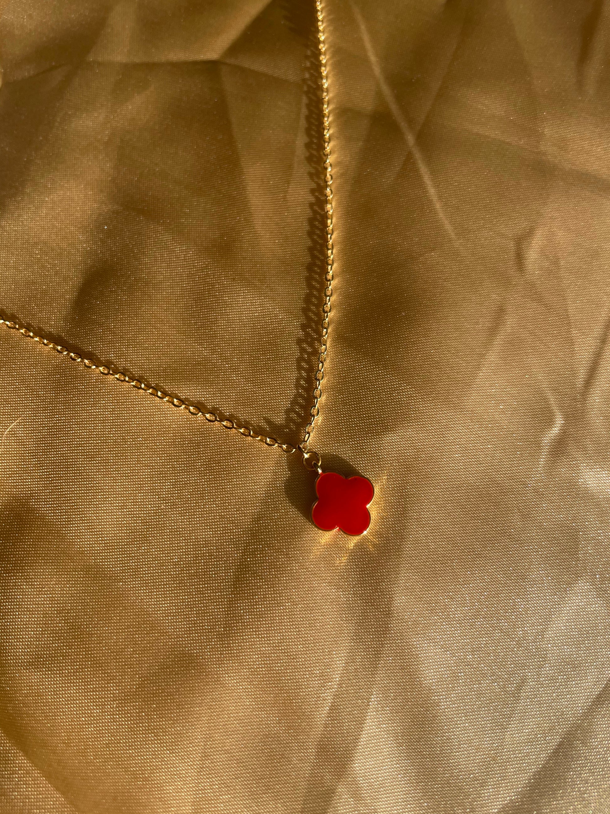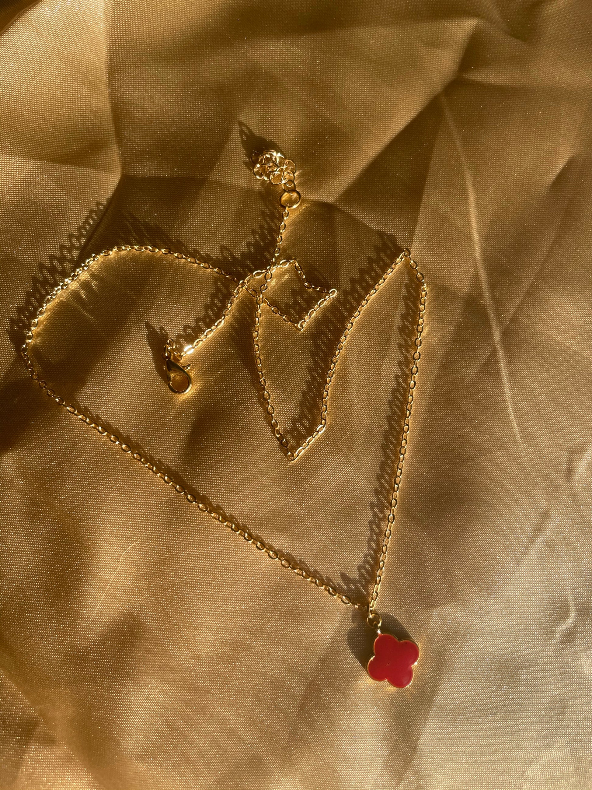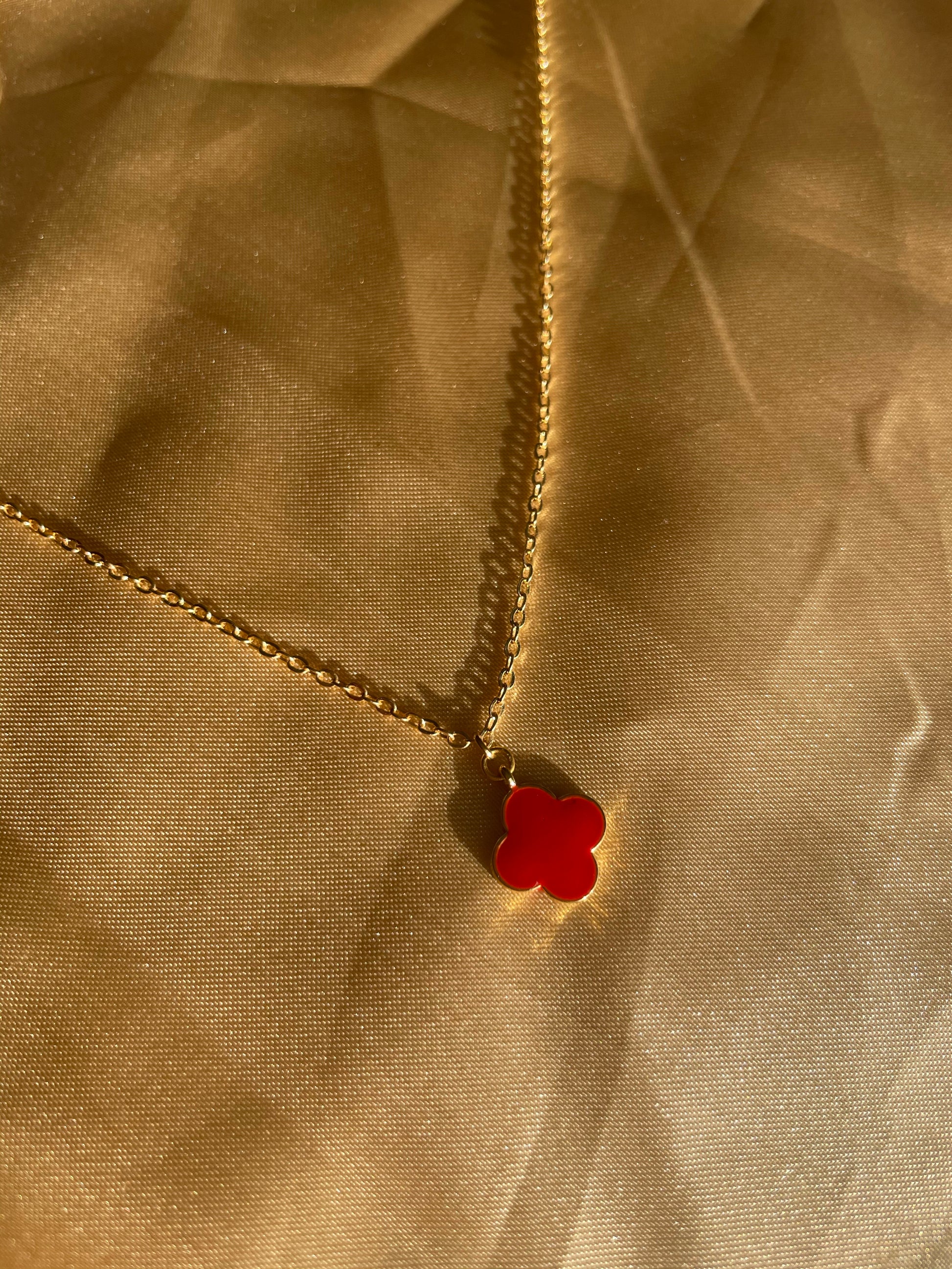 A beautiful 24kt gold plated red clover charm on a gold plated chain.