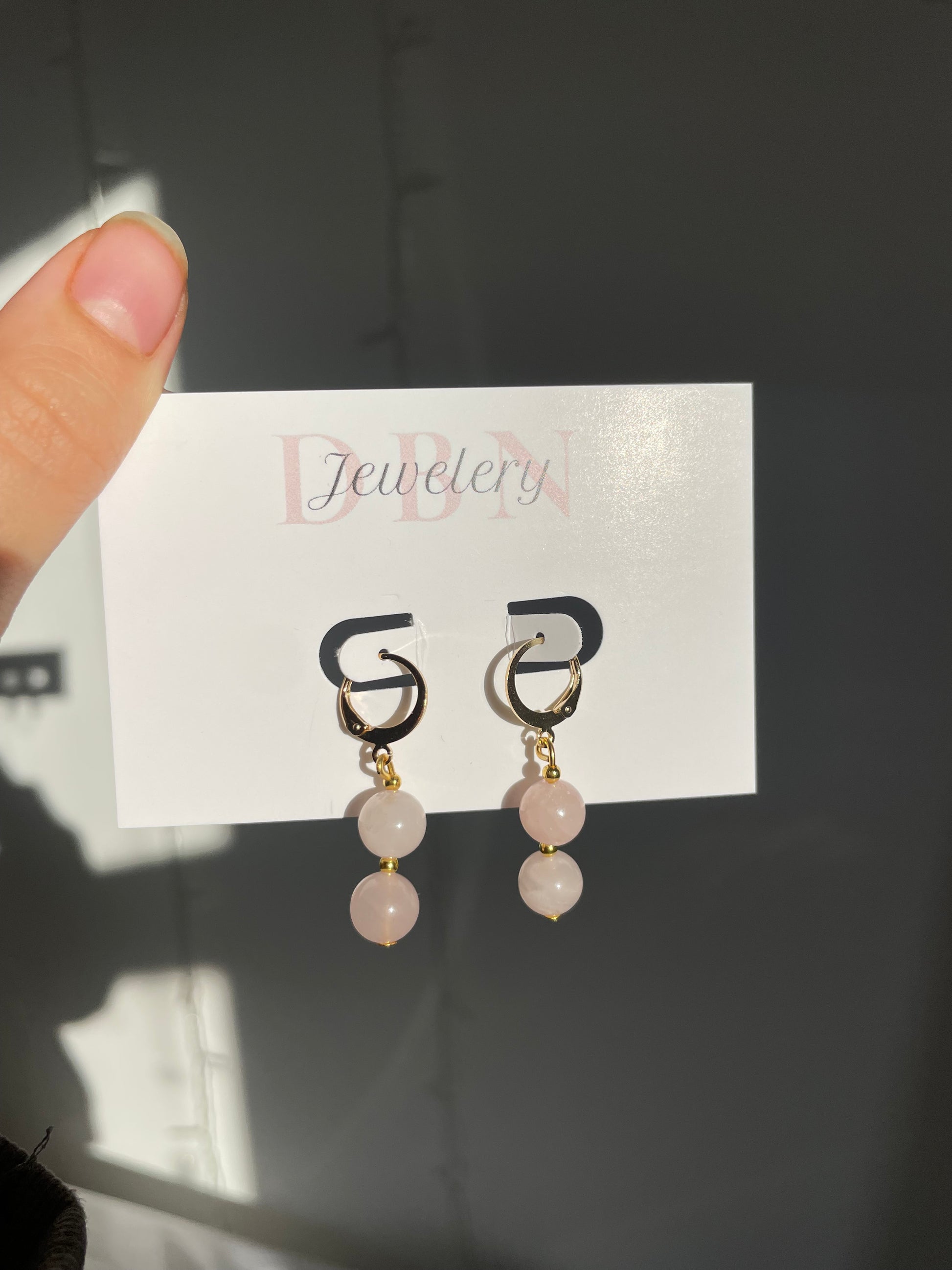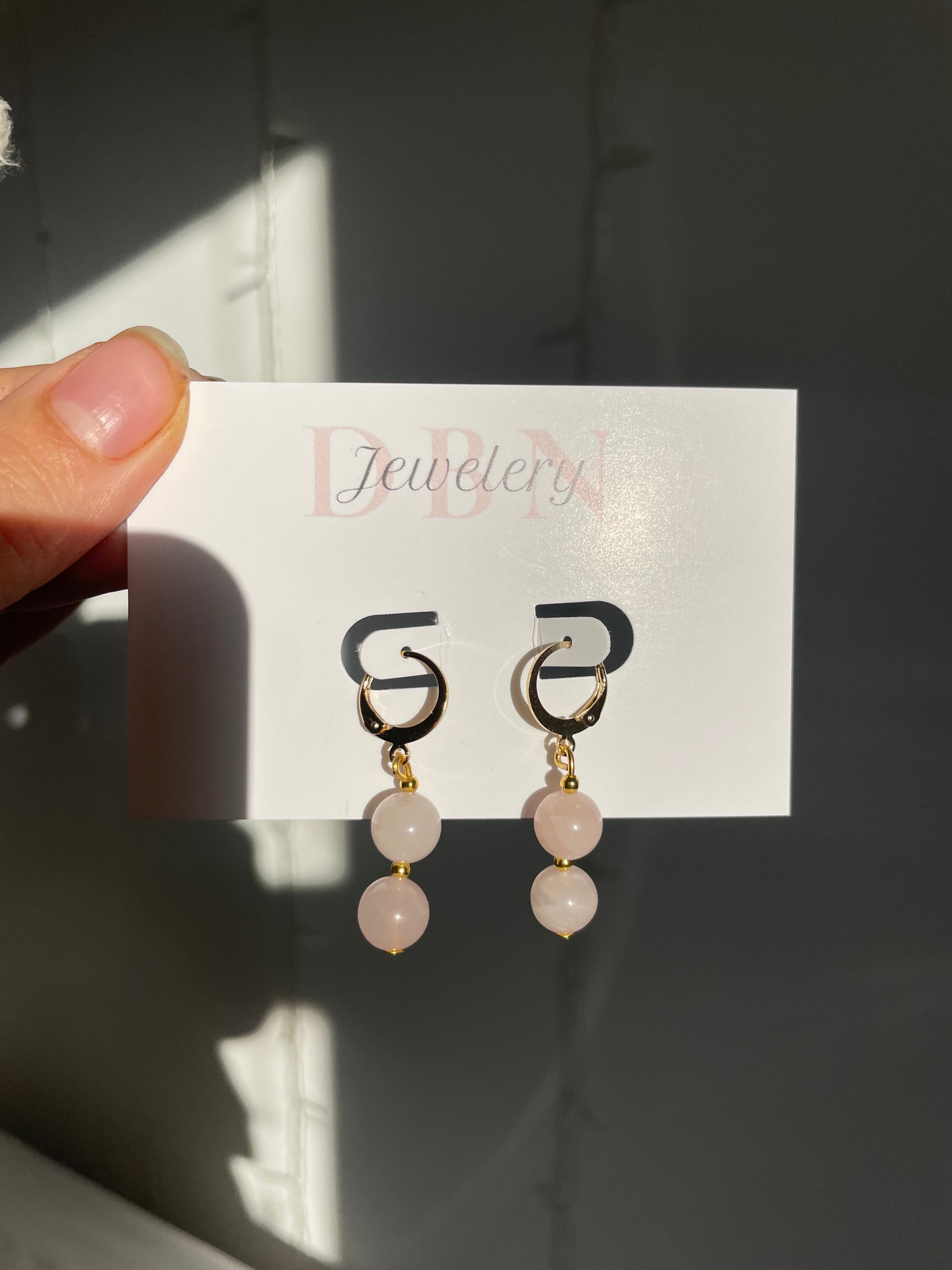 Double rose quartz bead earrings with a gold-coloured huggie hoop.