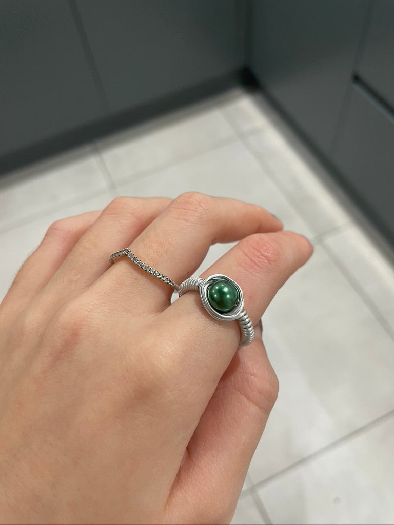 Dark Green Pearl Bead Silver Wire Ring