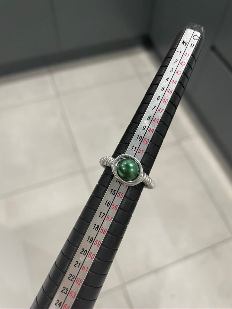 Dark green pearl bead wire wrap ring. A pearl bead with silver plated aluminium wire wrapping around. Multiple sizes available, there is a photo of a sizing chart to help ensure you order the correct size.