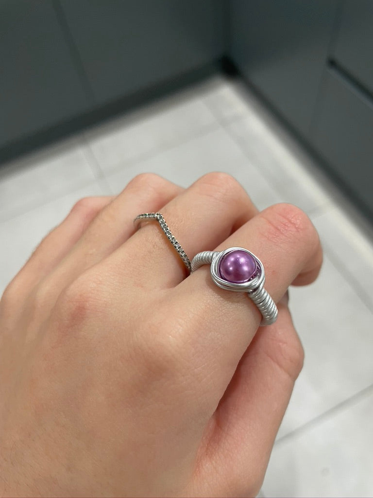 Purple pearl bead wire wrap ring. A pearl bead with silver plated aluminium wire wrapping around. Multiple sizes available, there is a photo of a sizing chart to help ensure you order the correct size.