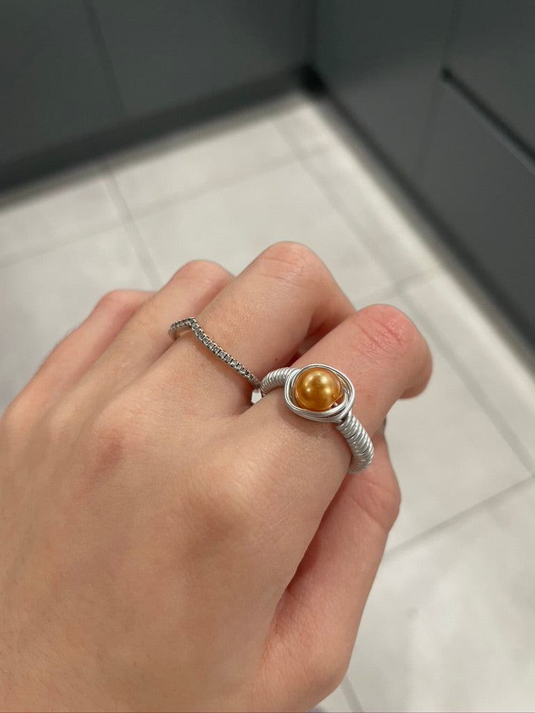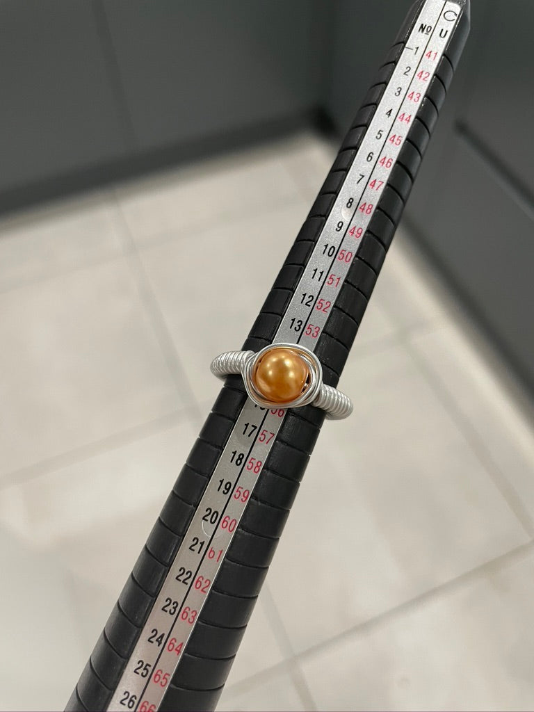 Orange pearl bead wire wrap ring. A pearl bead with silver plated aluminium wire wrapping around. Multiple sizes available, there is a photo of a sizing chart to help ensure you order the correct size.