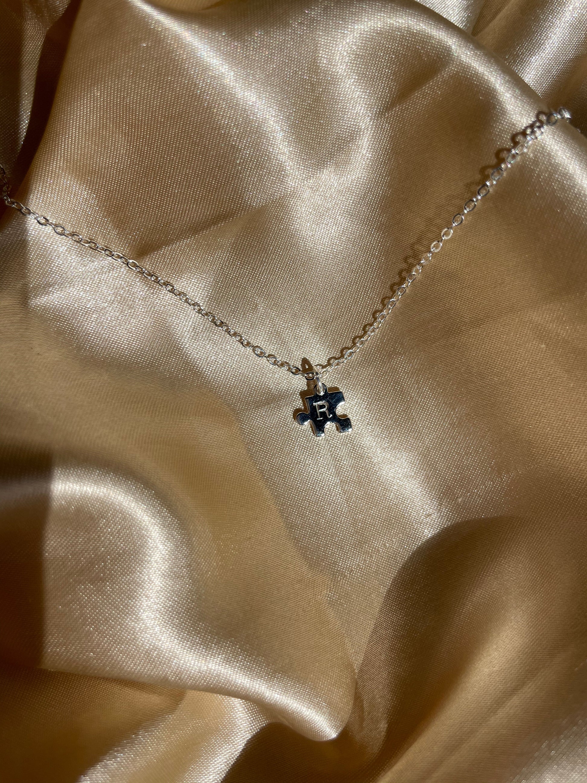 A beautiful silver plated puzzle piece charm on a silver plated chain.