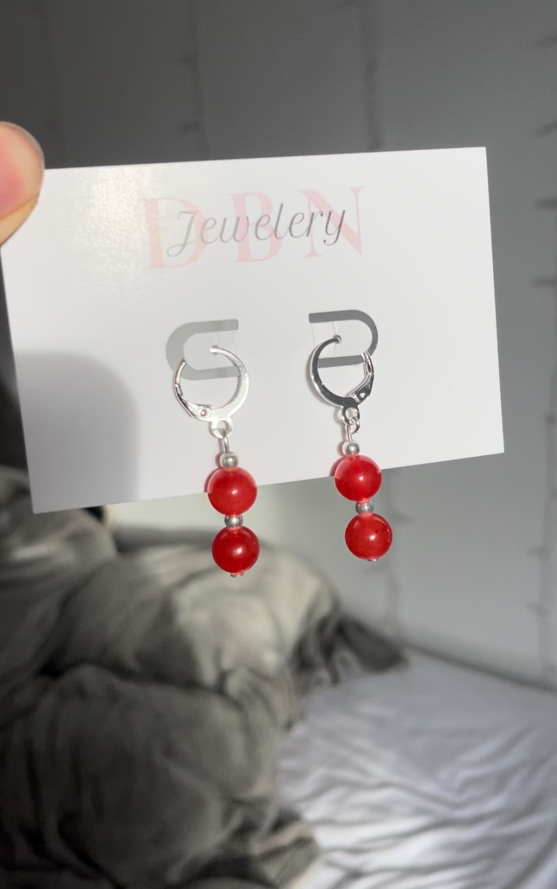Double evil eye bead earrings with a silver-coloured huggie hoop.