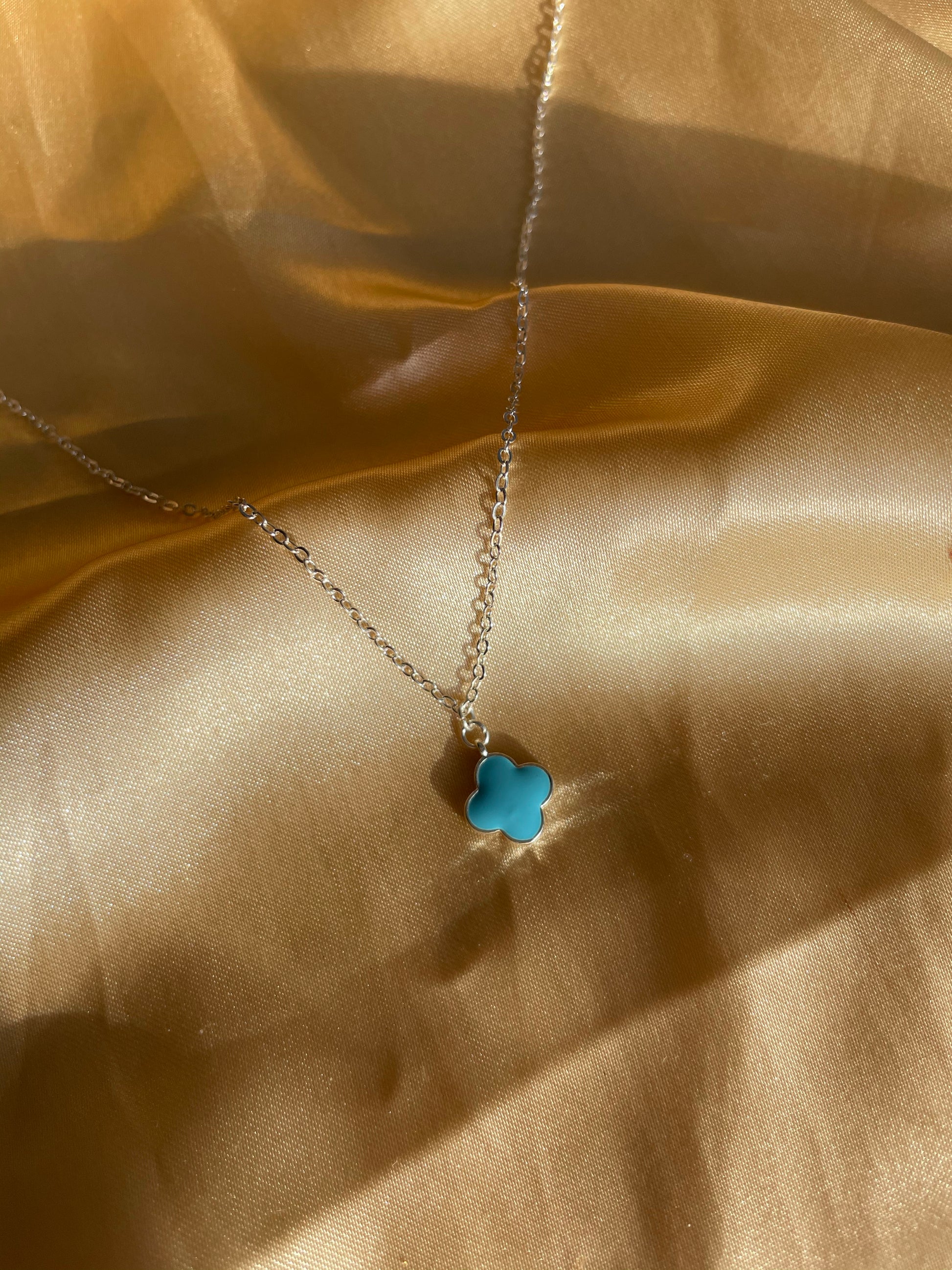 A beautiful silver plated blue clover charm on a silver plated chain.