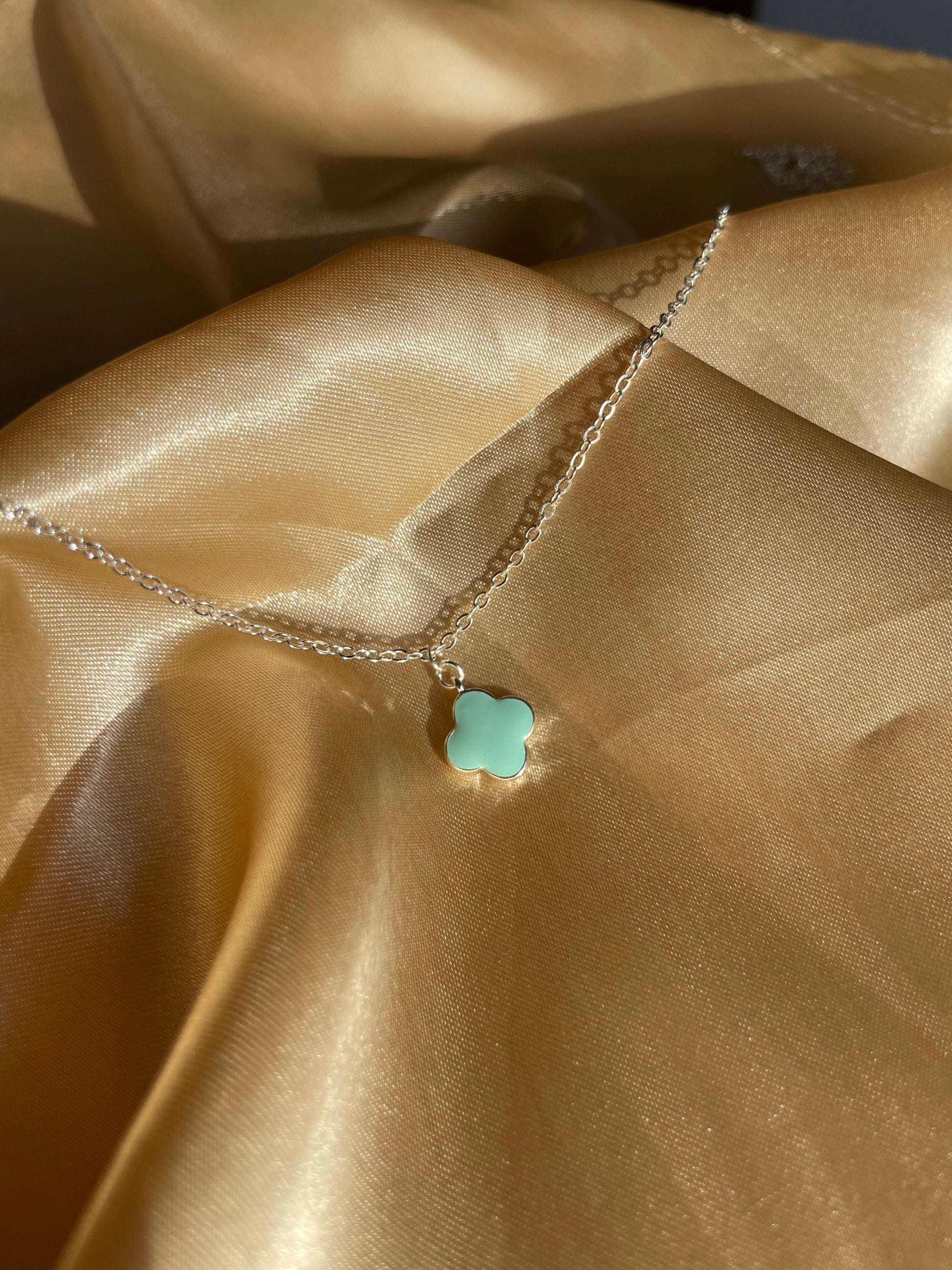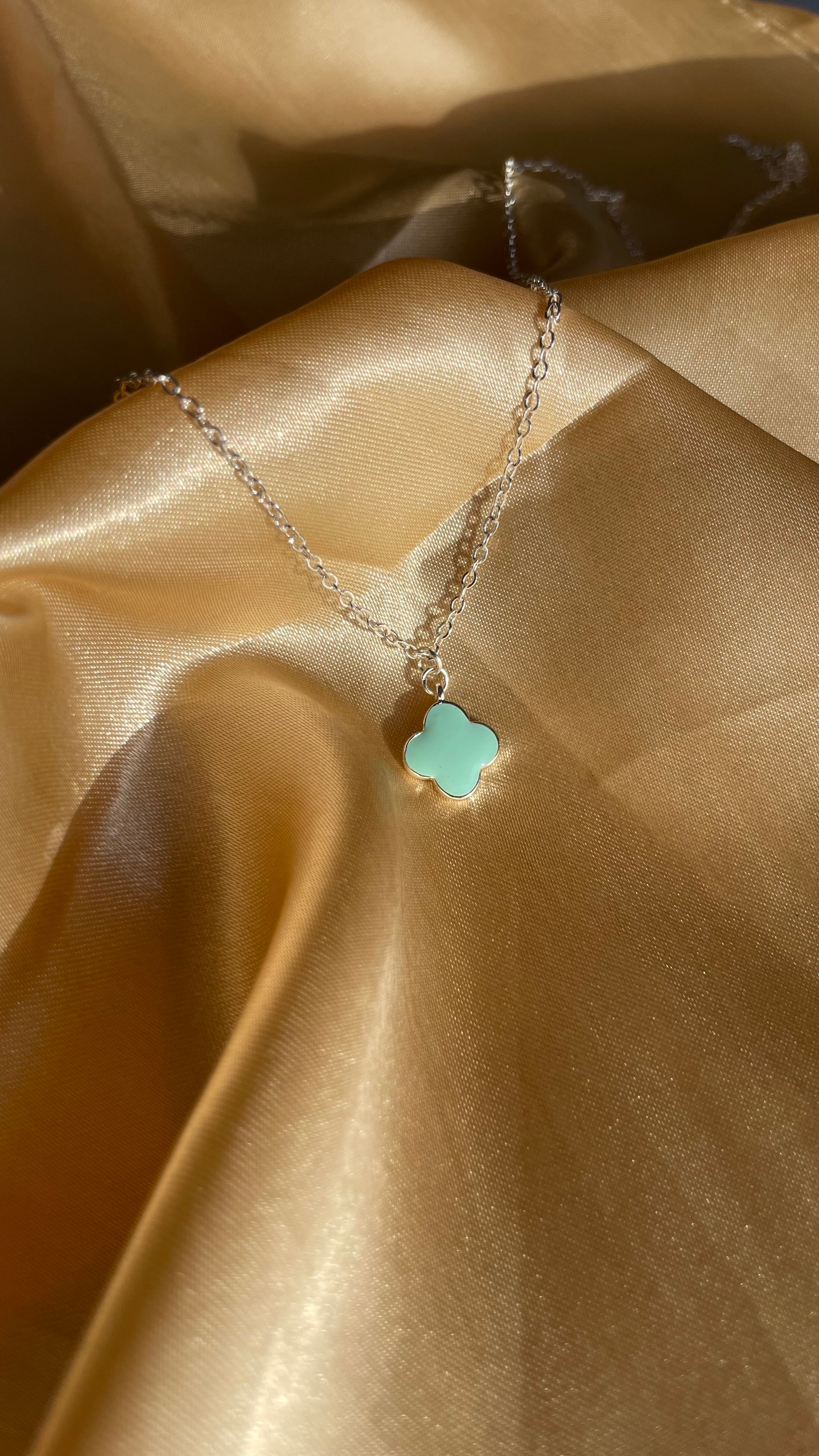 A beautiful silver plated mint clover charm on a silver plated chain.