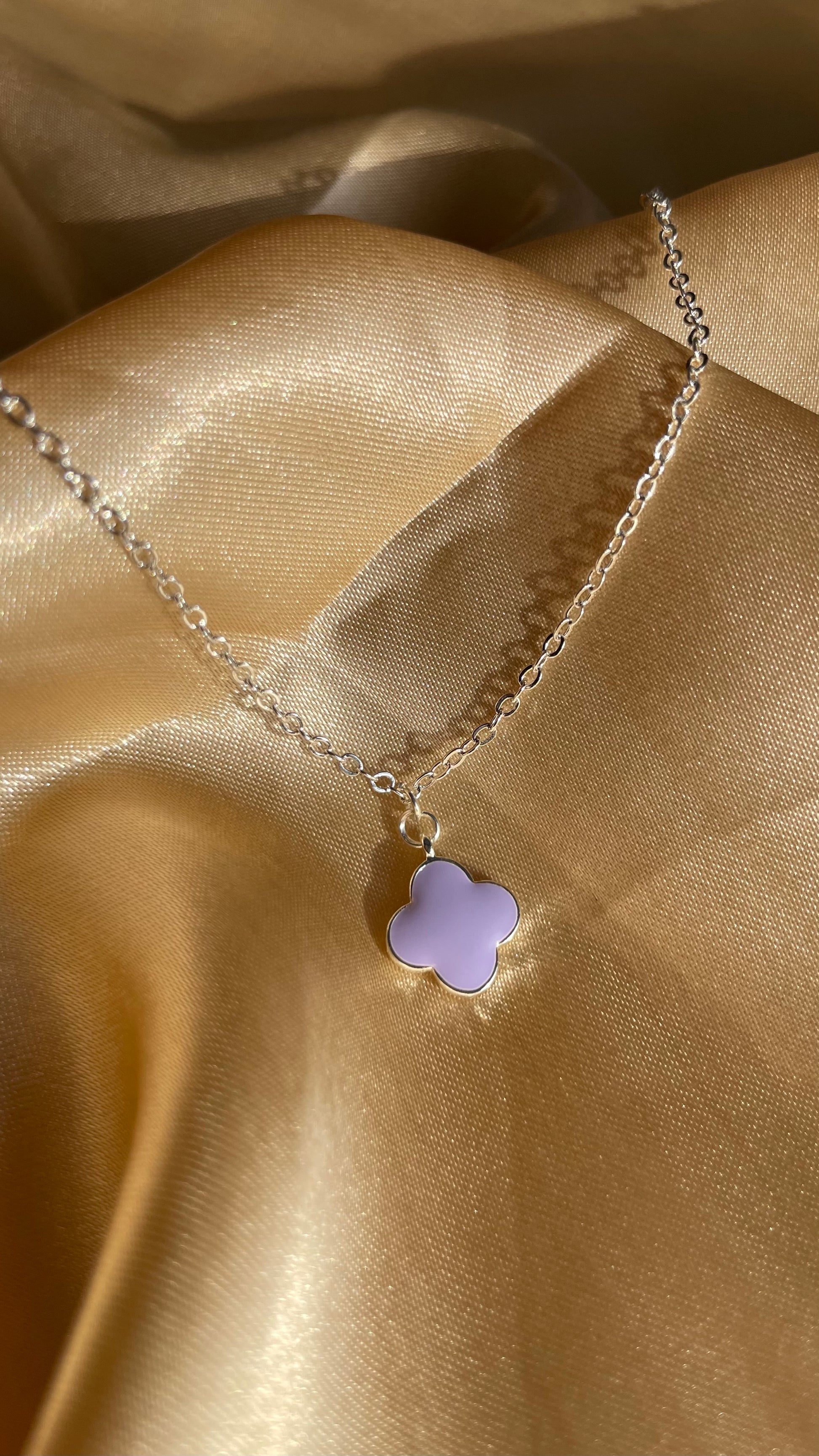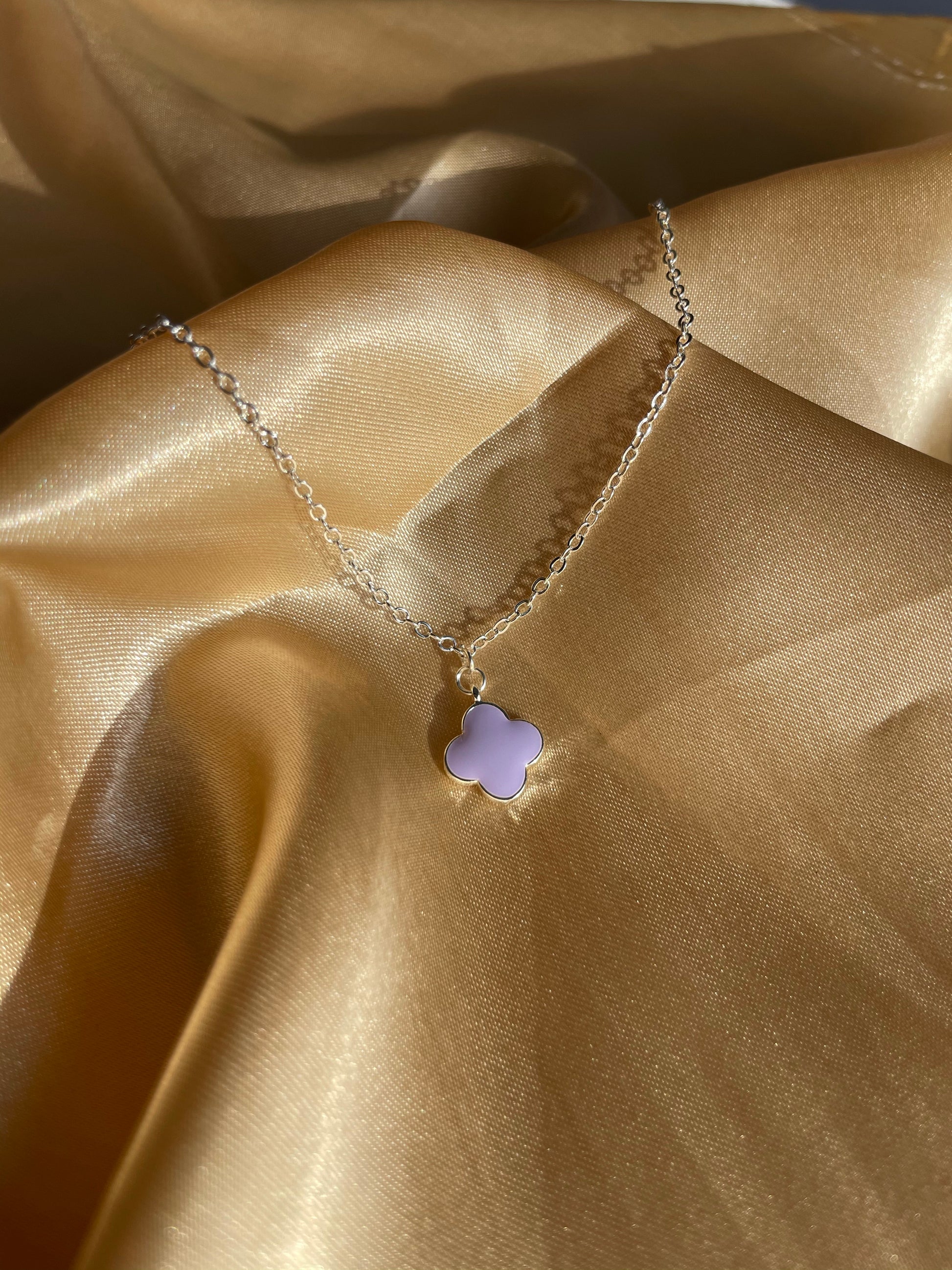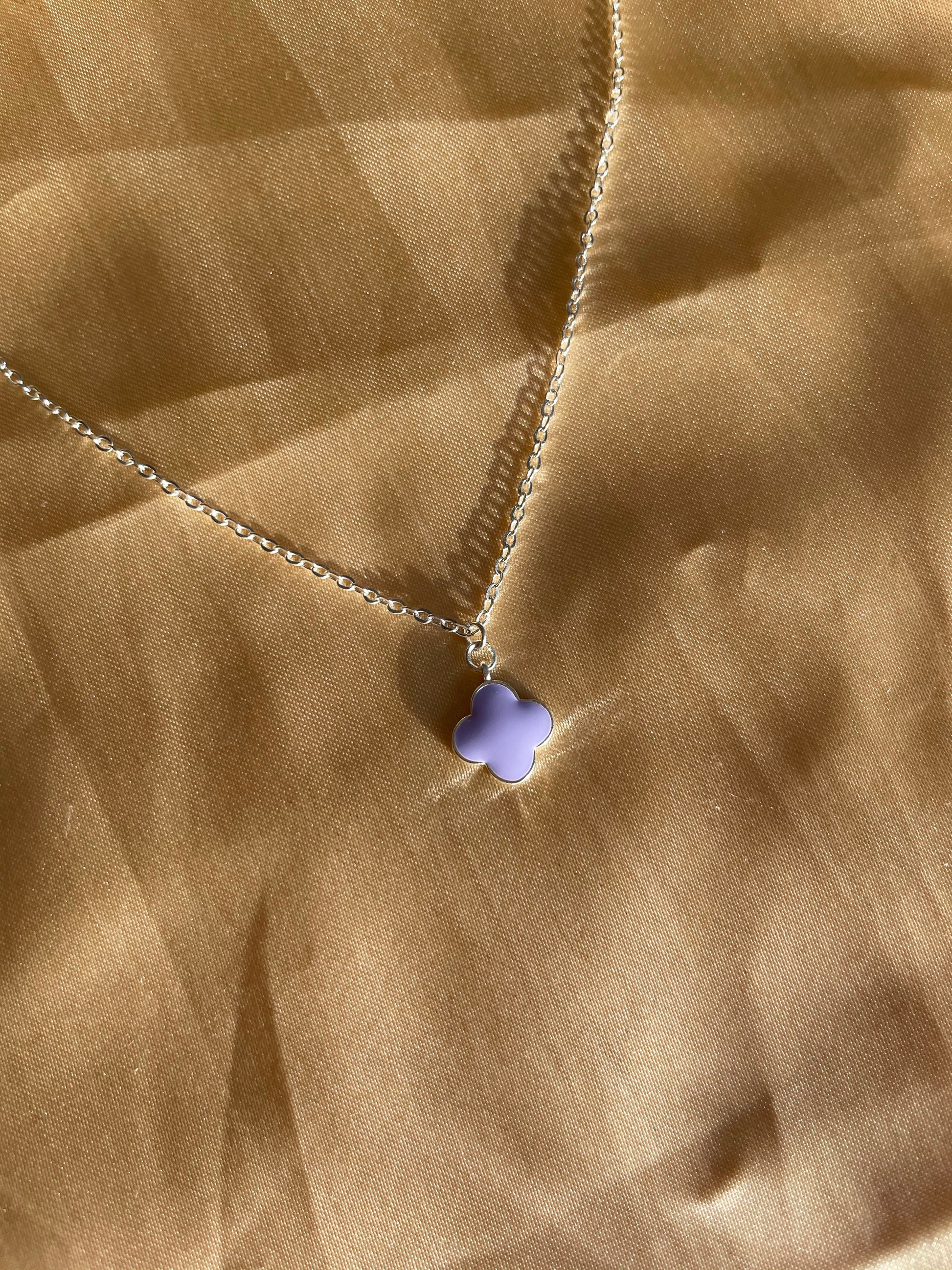 A beautiful silver plated purple clover charm on a silver plated chain.